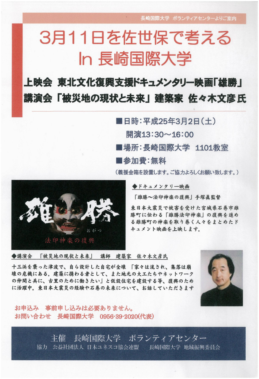 「3月11日を佐世保で考えるin長崎国際大学」が開催されます。